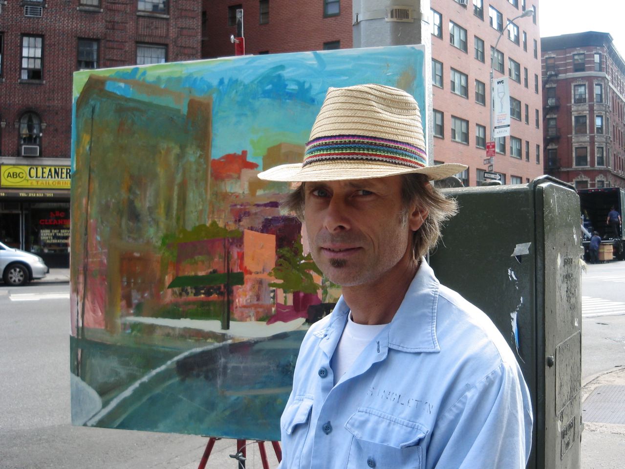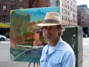 The day started kind of so-so.  I went to my café on Jane Street and it was packed, so I went to swim, but the pool was too crowded too (I have this thing where I really need a lane of my own or I won’t swim).  Finally I ended up eating a sandwich and opening my computer for all of five minutes at Doma, a little writer’s café on the corner of Perry Waverly and Seventh. Out of the window, beyond the Jade plants I see colors, streams of gorgeous blues and reds on a canvas. Next I’m outside taking pictures and asking questions.  The man with three brushes in his hand, who didn’t have a website or business card, but would like to sell his painting is John.  John lit up when I asked him about his painting and it made my day too.  Today John changed the way I saw the world. I looked up.  I don’t think I’ll ever look at New York the same way again.